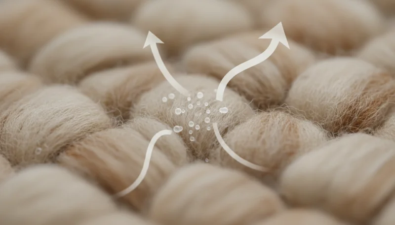 Популярное заблуждение звучит так: шерсть нужна только зимой, чтобы греться. На самом деле она помогает и при перепадах температуры. Шерсть способна поглощать влагу до 30–35% от собственного веса и при этом не становиться мокрой на ощупь. Влага испаряется постепенно, и тело остаётся в комфортной среде.