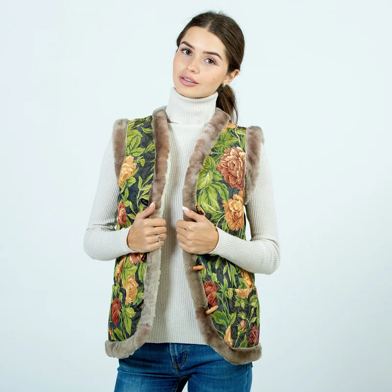 Тёплый и эффектный жилет, выполненный из натуральной кусковой овчины и украшенный Павлово-Посадским гобеленом с классическим русским орнаментом «Цветы». Мягкий мех по периметру изделия создает уют и изысканность.
