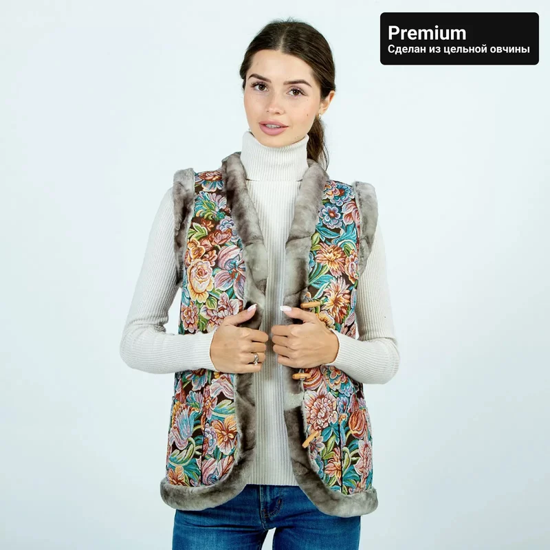 Жилет из натуральной овчины с гобеленом «Цветы» Premium. Из цельной овчины